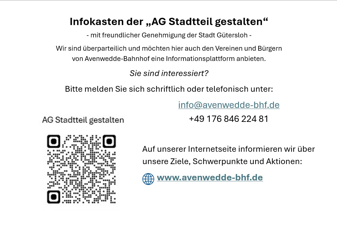 Die AG Stadtteil gestalten Avenwedde-Bahnhof, unterstützt vom Verein Werkstatt für nachhaltige Umweltkonzepte im Kreis Gütersloh e.V., möchte auf der öffentlichen, städt. Fläche – nahe des Bücherschranks am Kreisverkehr, Friedrichsdorfer Str. /Güthstr. – einen Schaukasten aufstellen. Im Schaukasten möchten wir über unsere Aktionen, Fortschritte zur Stadtteilarbeit und über Veranstaltungen/Termine im Ortsteil informieren. Wir engagieren uns ehrenamtlich, überparteilich und verfolgen keine kommerziellen Absichten.